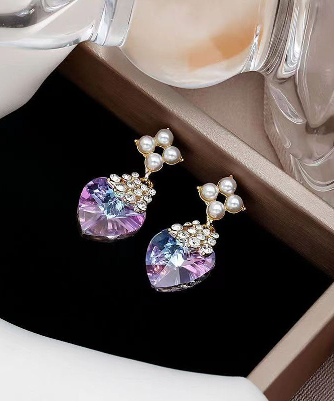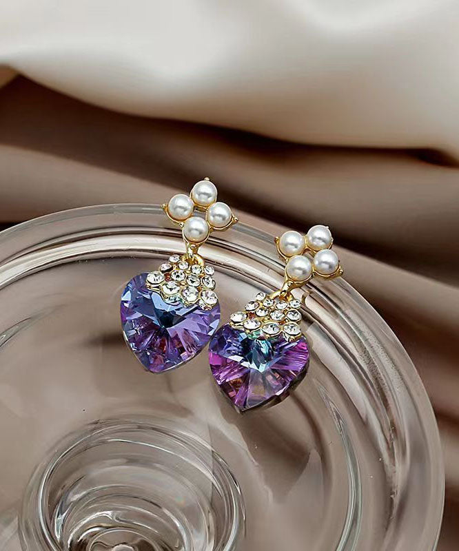 Hermosos aretes colgantes de plata esterlina morada con incrustaciones de circonitas y perlas de cristal.