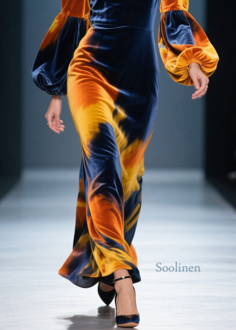 Hermoso vestido largo de terciopelo con efecto tie-dye y cuello en V y mangas farol
