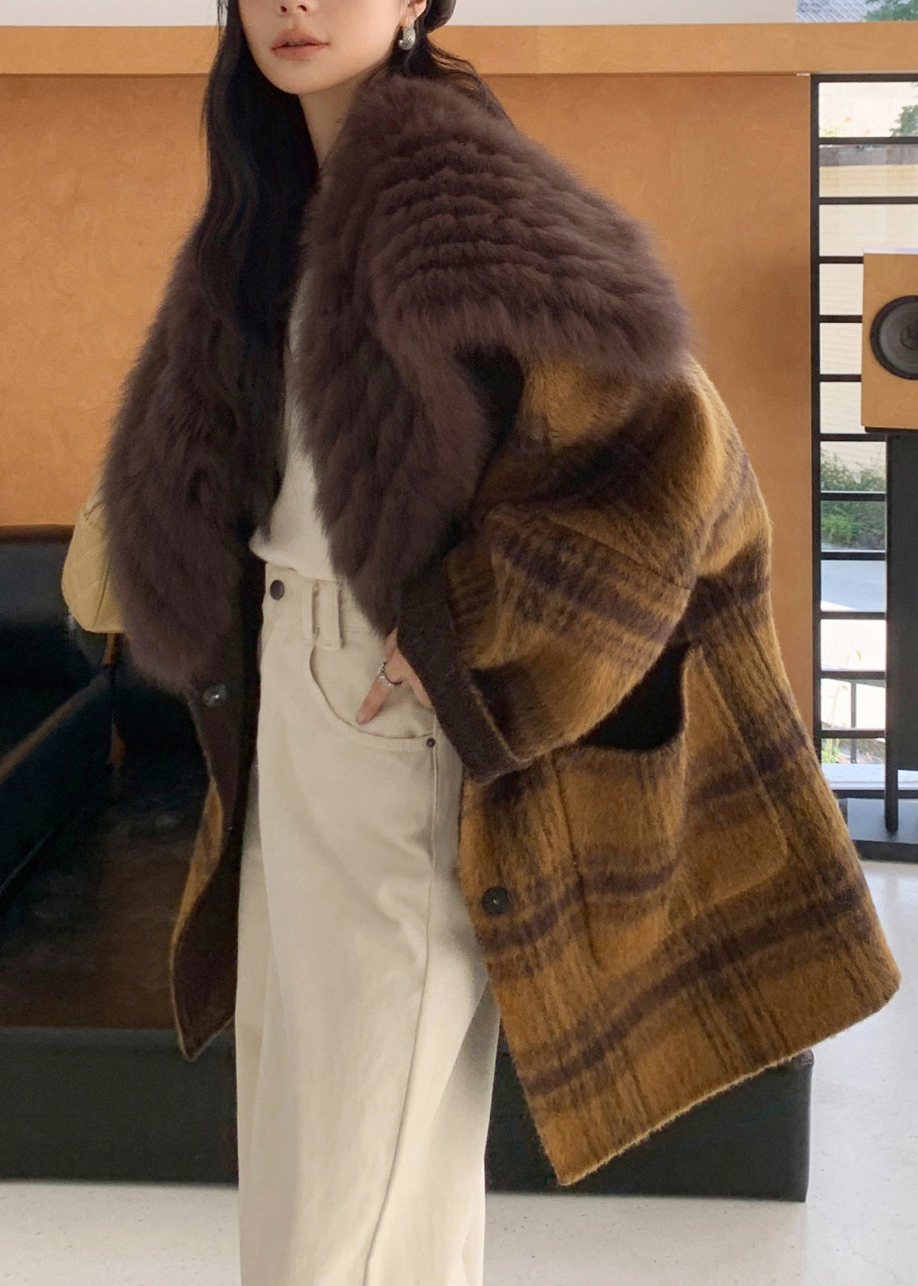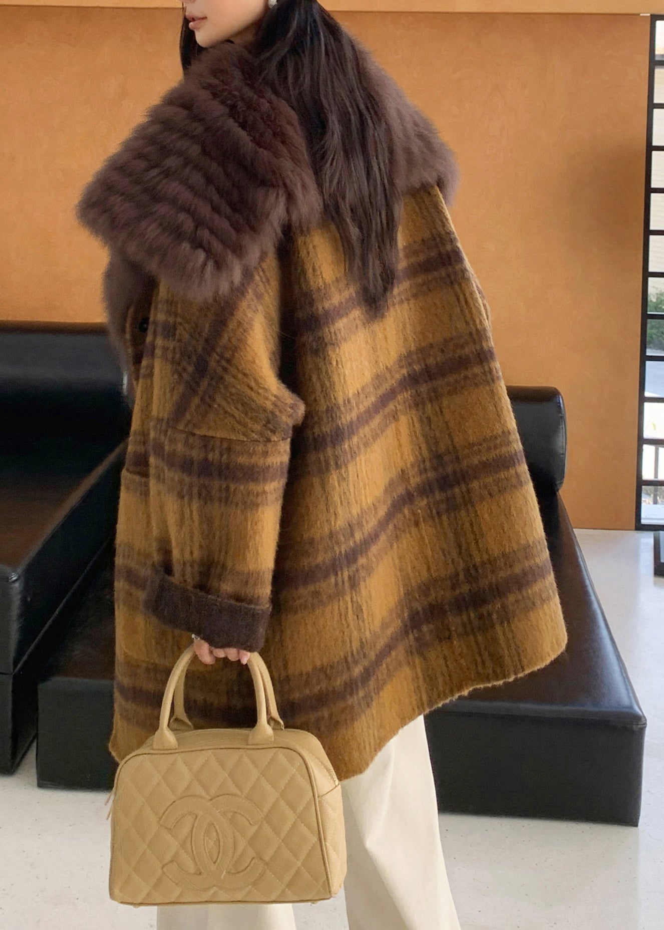 Hermosos abrigos de lana con cuello de piel amarilla y bolsillos a cuadros para usar en ambos lados. Primavera.