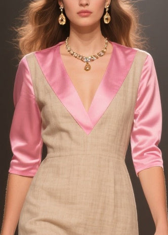 Beige Patchwork Linen Silk Dresses Ruffled Side Open Summer