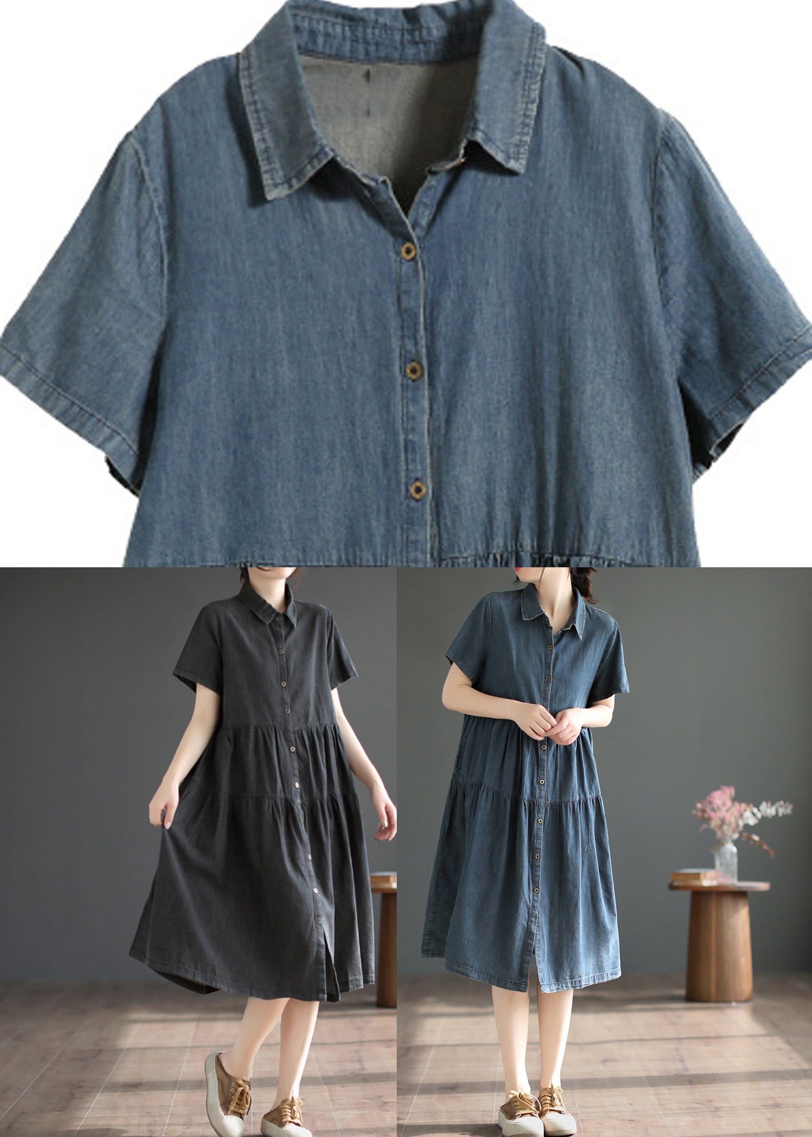 Vestido camisero largo de mezclilla de seda con botones y cuello Peter Pan negro y manga corta