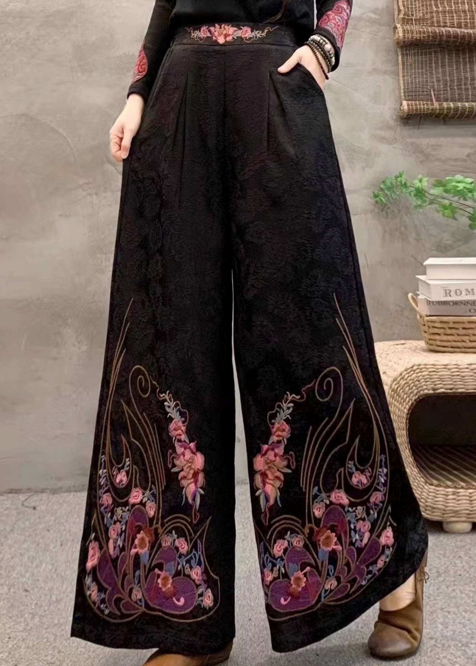 Black Retro Pockets Warm Fleece Pants Embroidered Winter