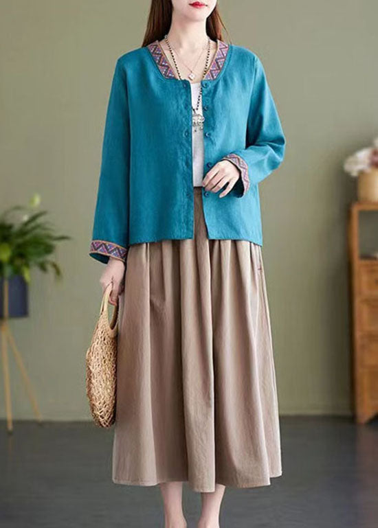 Camisa de lino con cuello en V azul bohemio y patchwork bordado para primavera