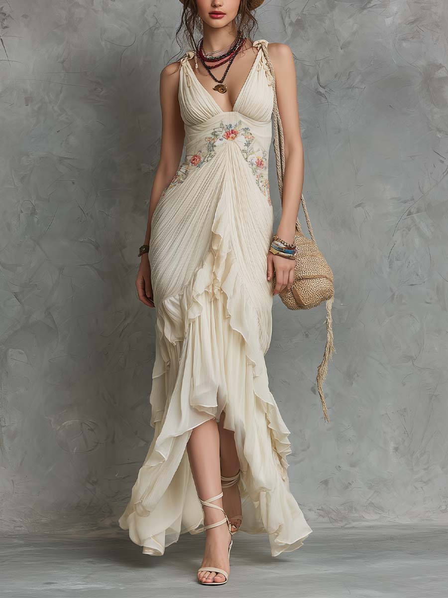 Boho-Vintage Elegant Embroidered Chiffon Ruffle Maxi Dress