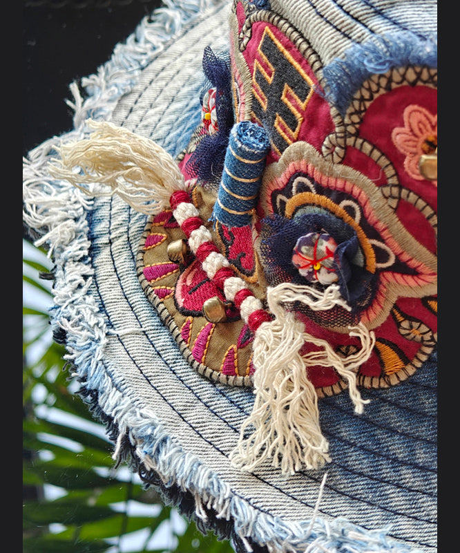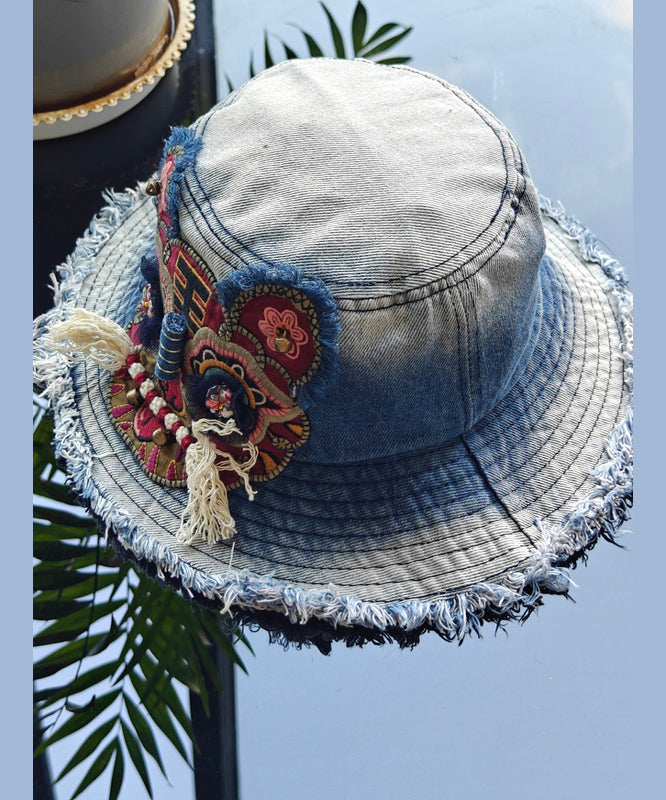 Boutique Blue Embroidered Tiger Head Denim Bucket Hat