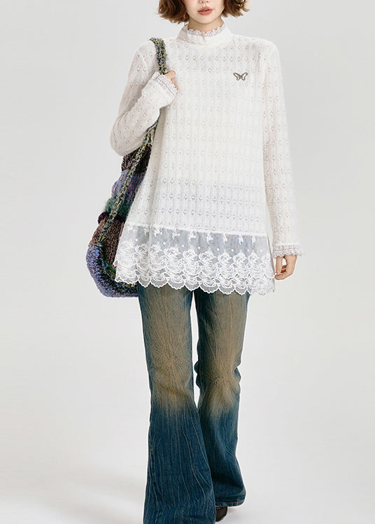 Boutique White Hign Neck Patchwork Lace Top Spring