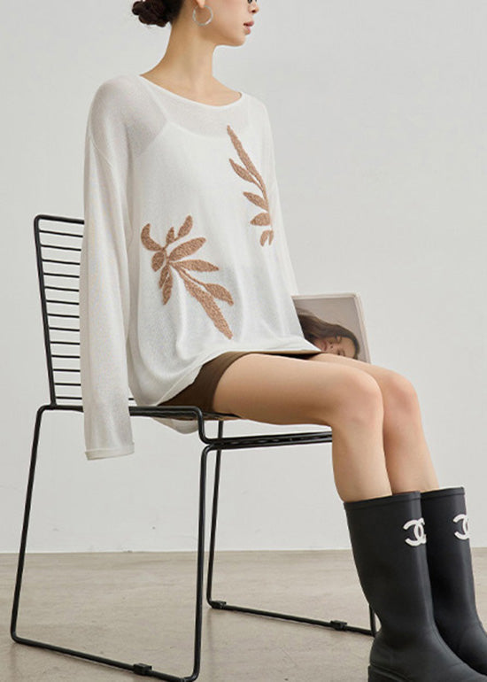 Boutique White O Neck Embroidered Knit Blouses Fall