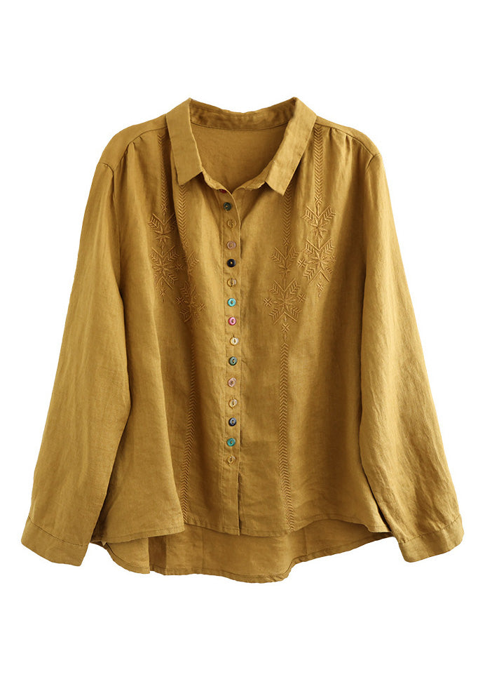 Camisa corta de lino bordada con cuello Peter Pan amarillo para primavera