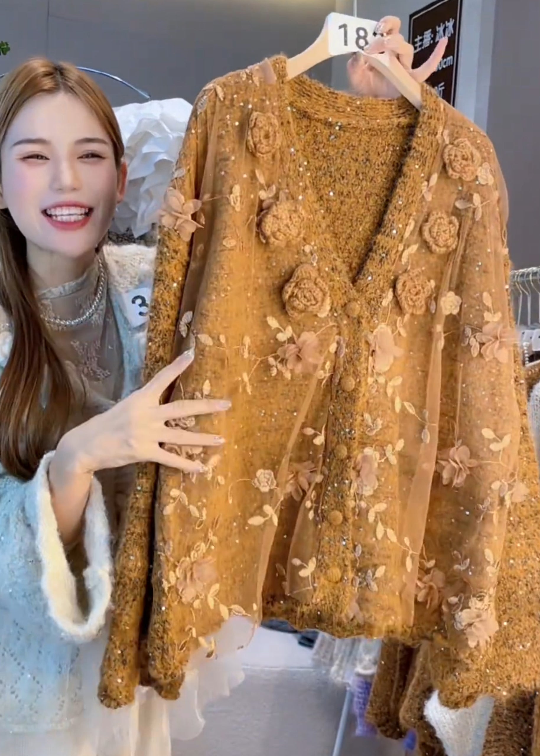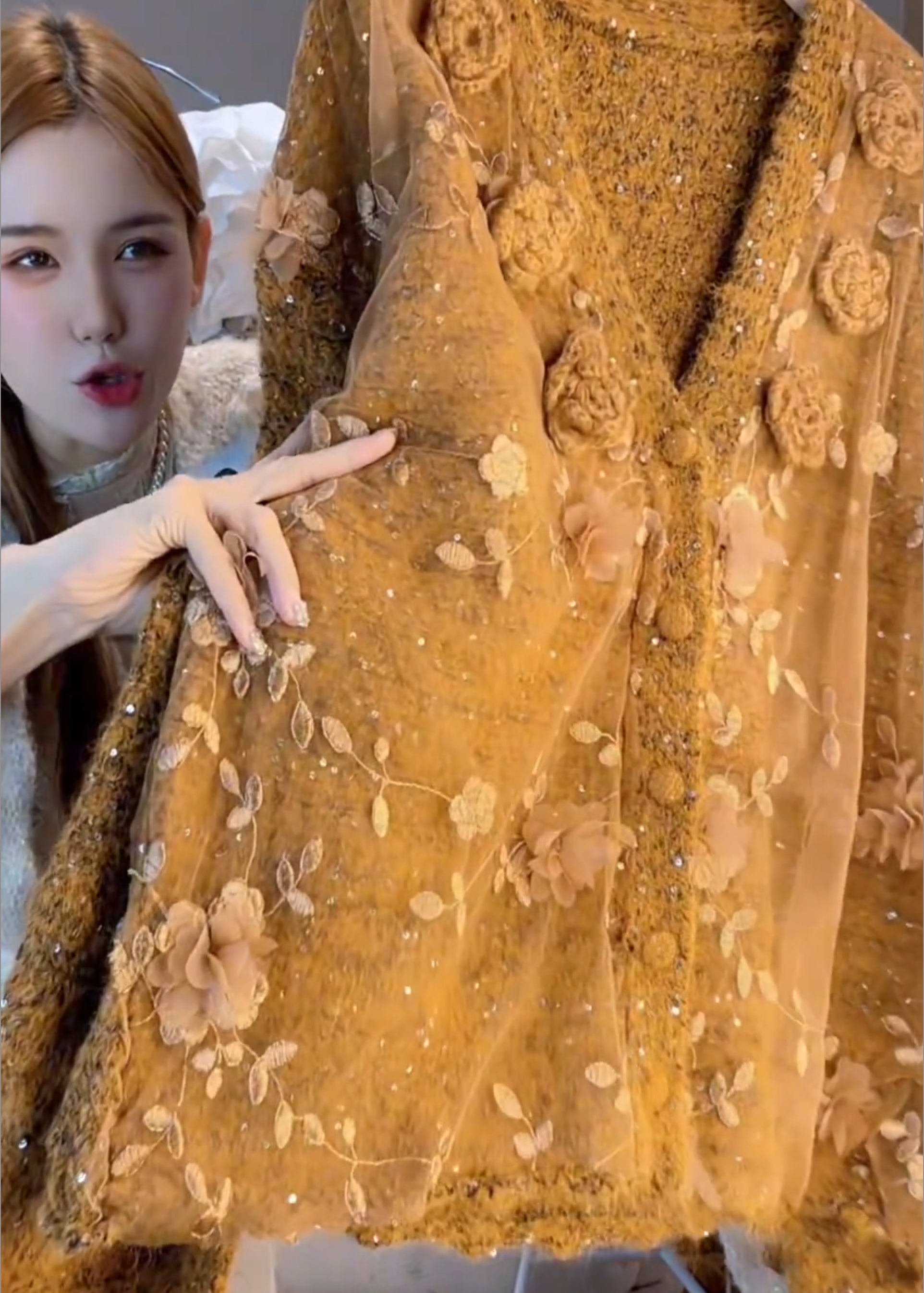 Chic Caramel Oversized Floral Decorated Knit Cardigan Winter