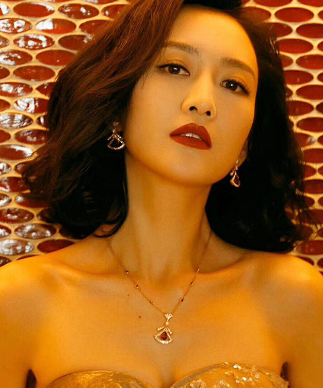 Elegante collar con colgante en forma de abanico de circonita y gema dorada de plata de ley roja