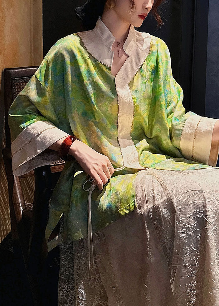 Chinese Style Yellow Print Lace Up Silk Shirt Top Fall