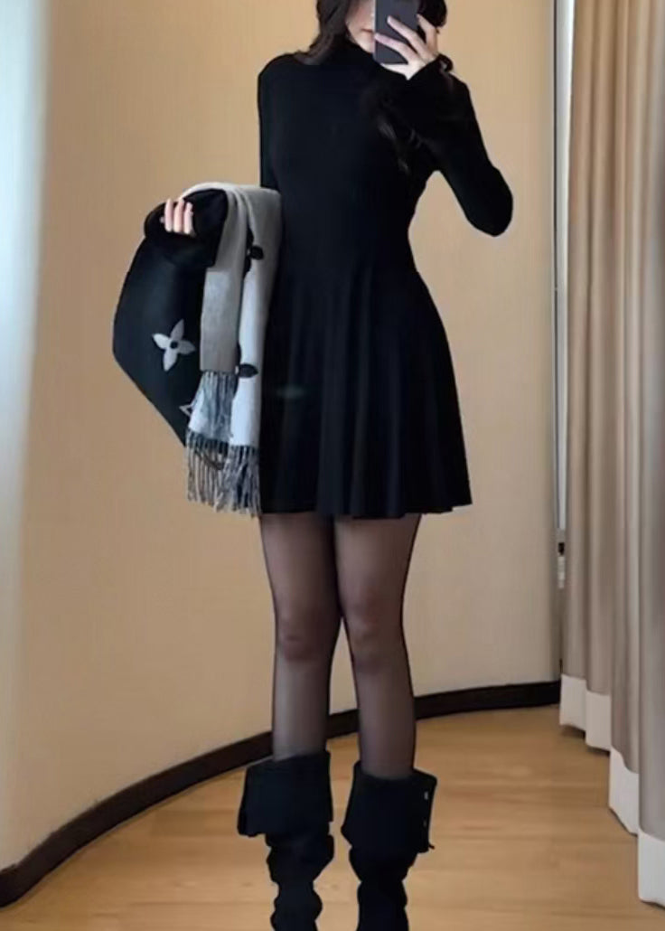 Classy Red Stand Collar Silm Fit Cotton Mid Dress Flare Sleeve