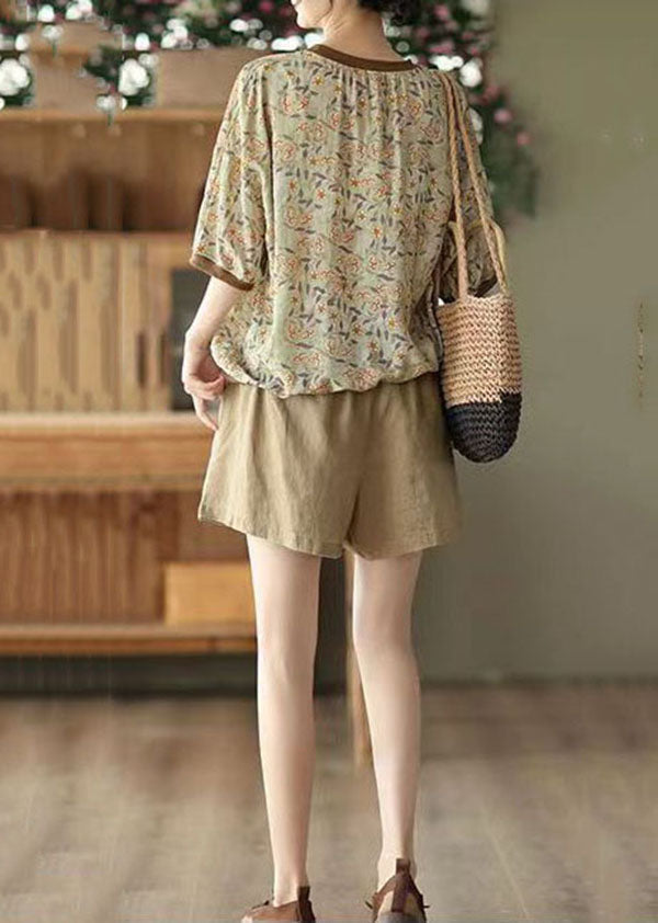 Camiseta de lino con patchwork de café y cuello redondo y manga corta