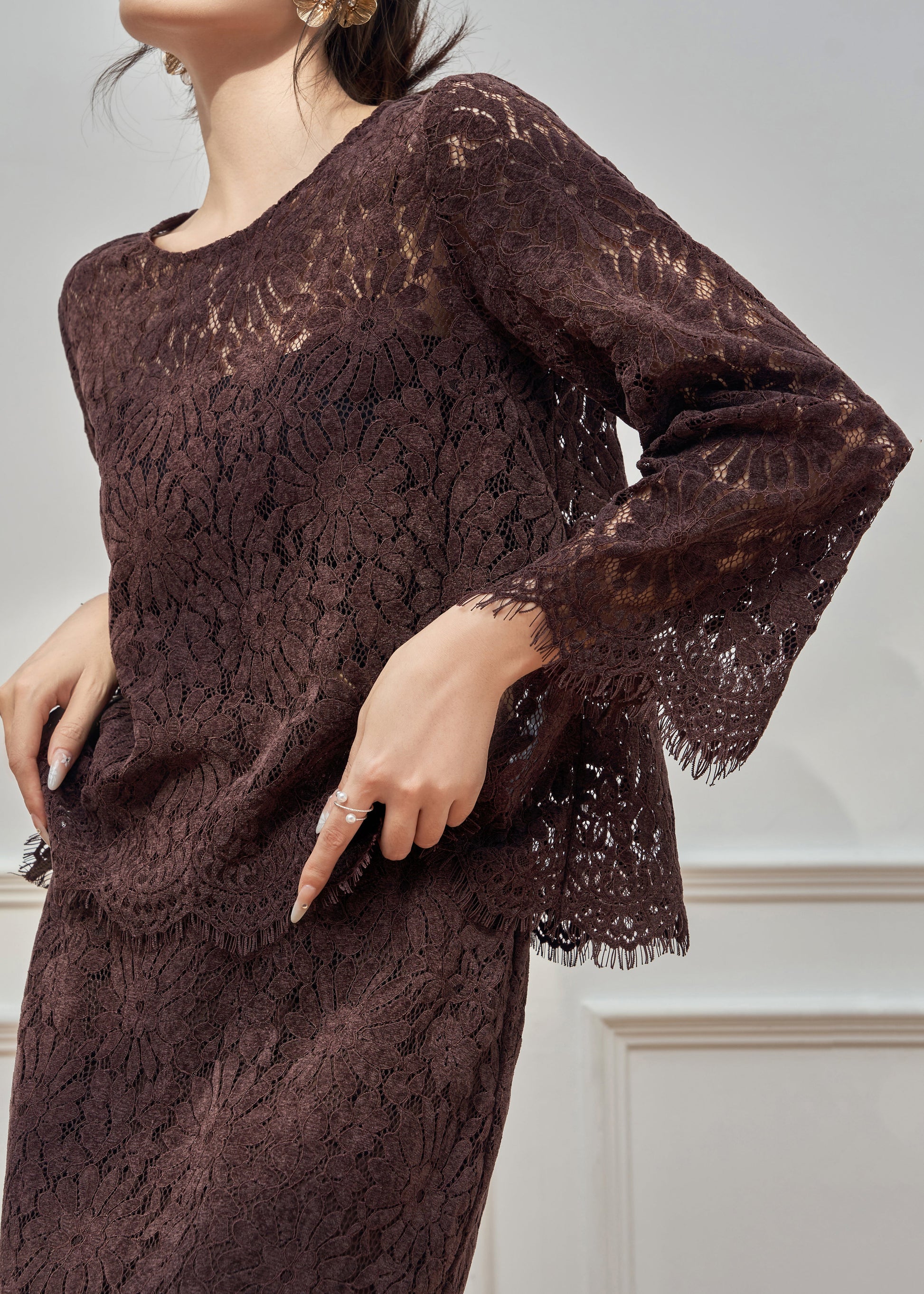 Elegant Coffee O Neck Hollow Out Lace Two Pieces Set Fall