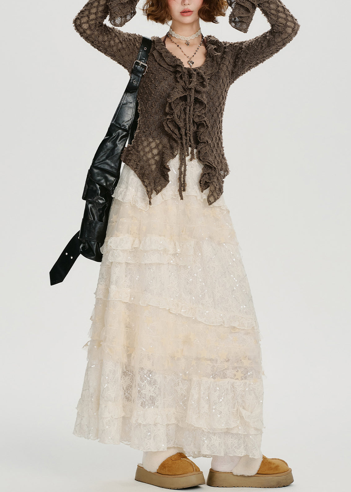 Camisas elegantes de punto con volantes y mangas acampanadas en color café