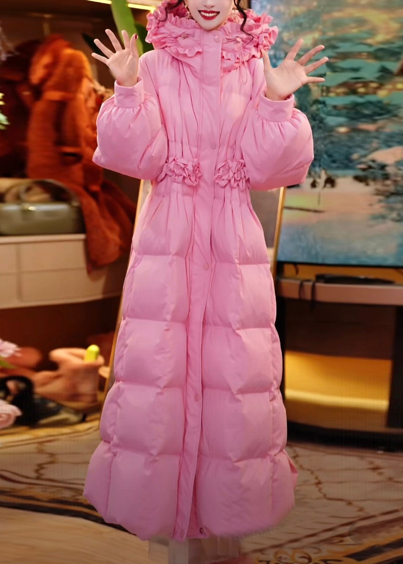 Abrigo largo de invierno con capucha y volantes en color rosa, elegante y abierto en los laterales.