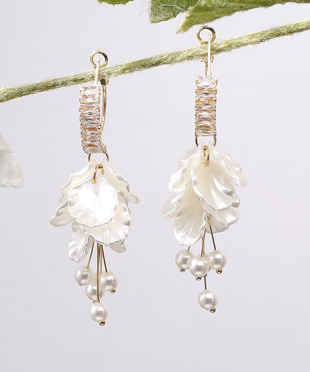 Elegantes pendientes colgantes con borlas florales de perlas y circonitas doradas de aleación blanca