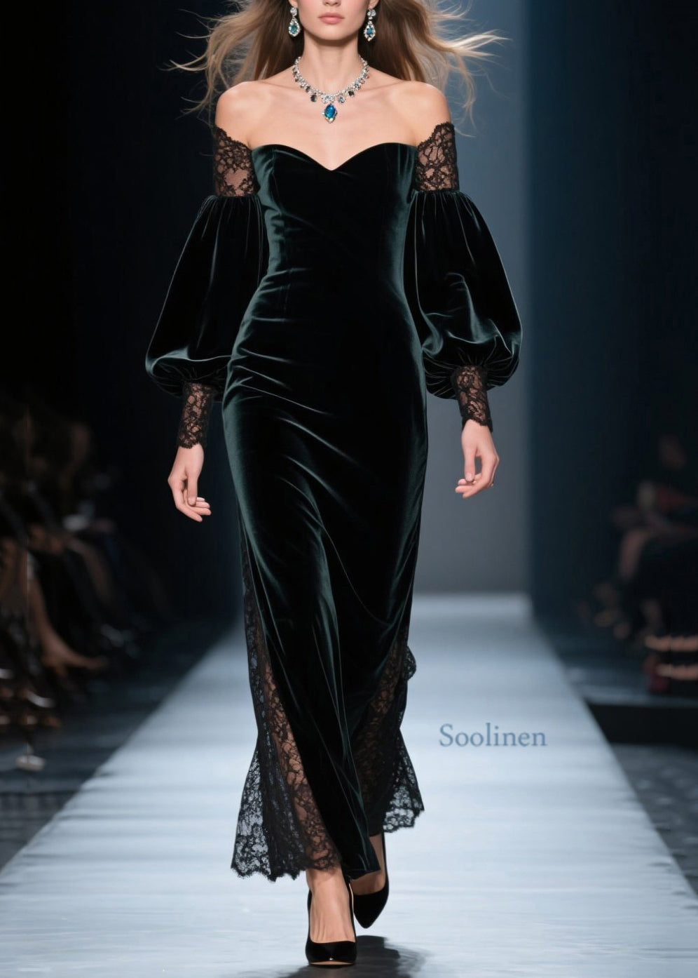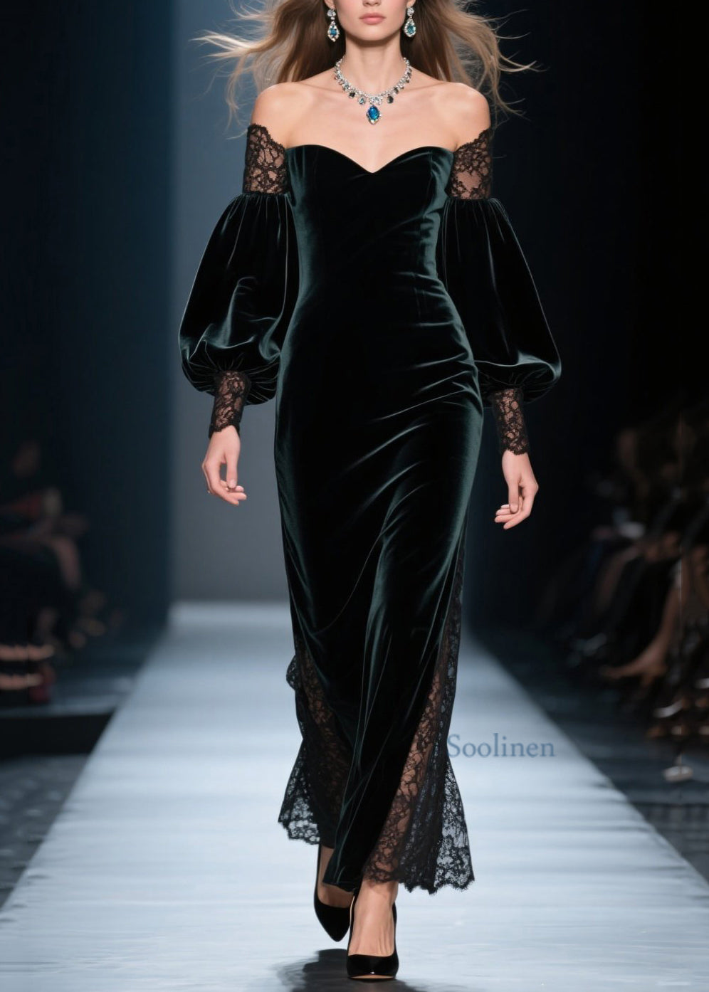 Vestidos de terciopelo con retazos de encaje y hombros descubiertos de color verde negruzco de moda para primavera