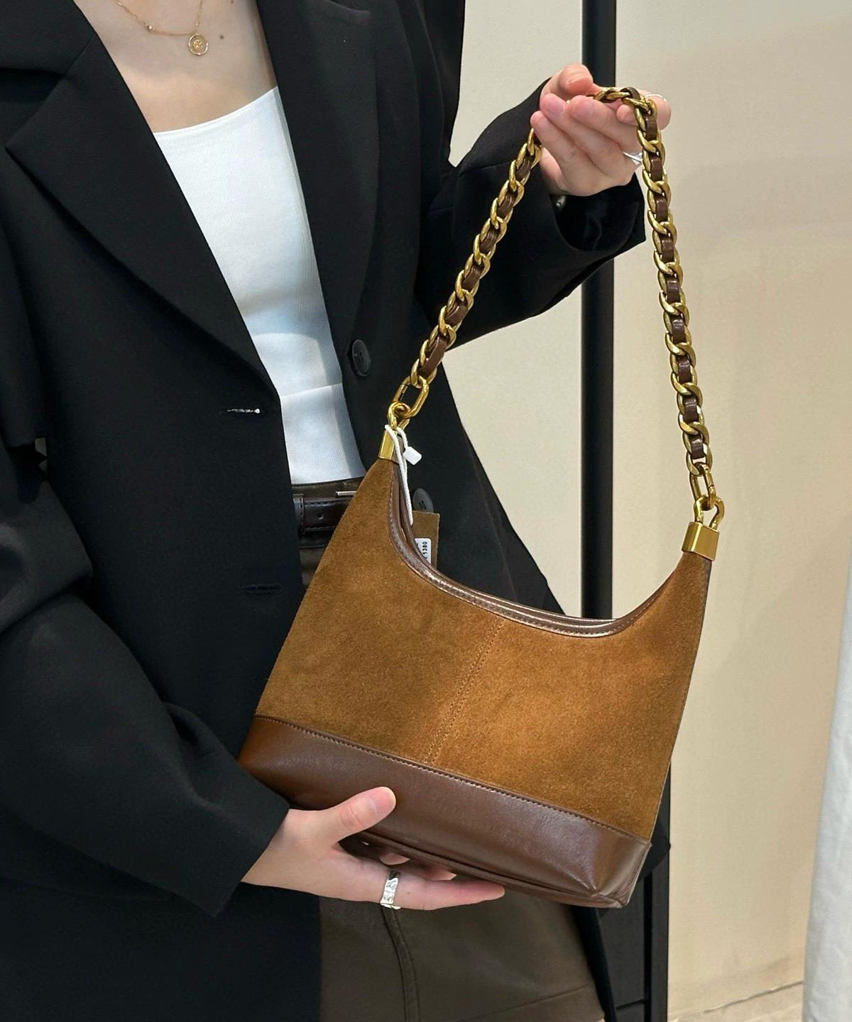 Bolso de cubo de ante con parches de color marrón y cadena de eslabones