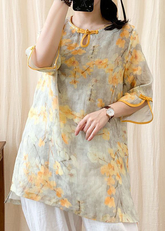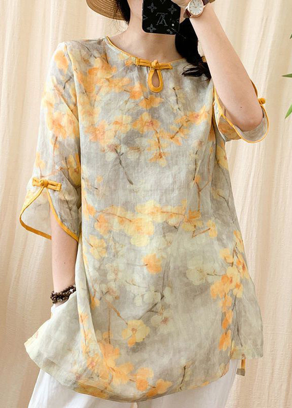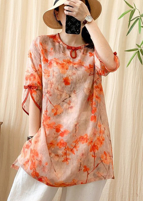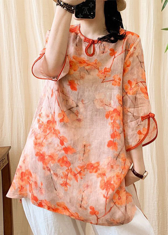 Camisa de lino con cuello redondo, botones laterales y media manga, color naranja