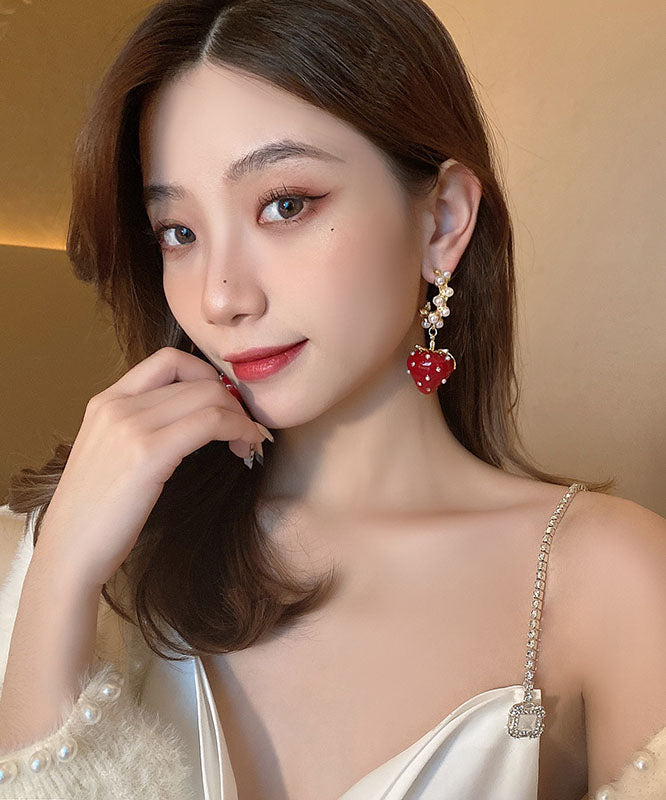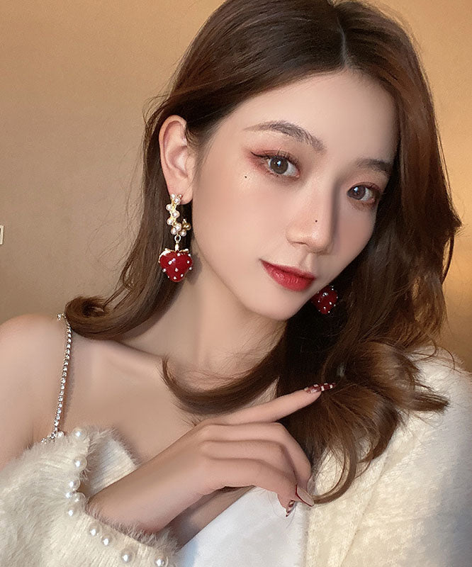 Pendientes colgantes de fresa con jade y circonita de aleación roja de moda