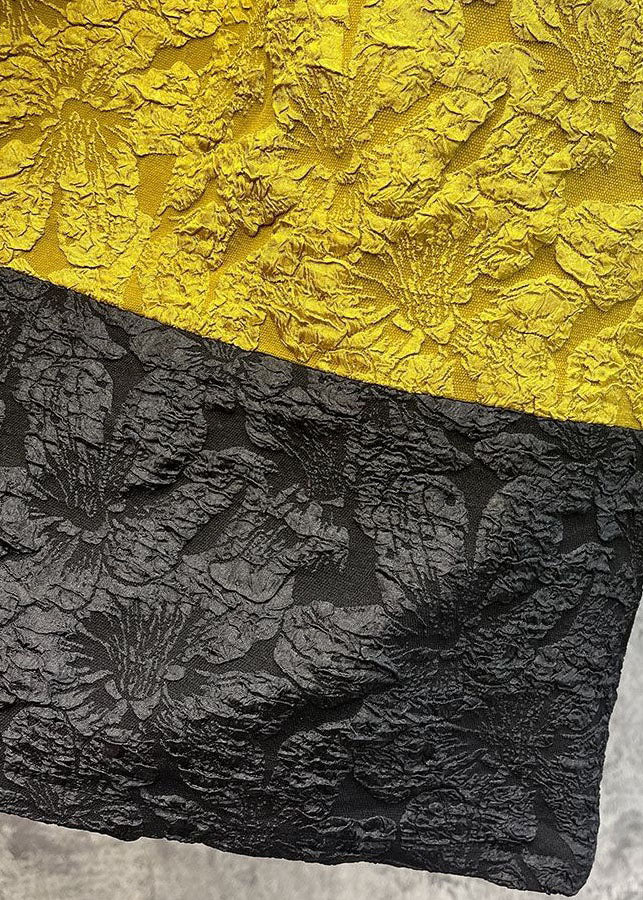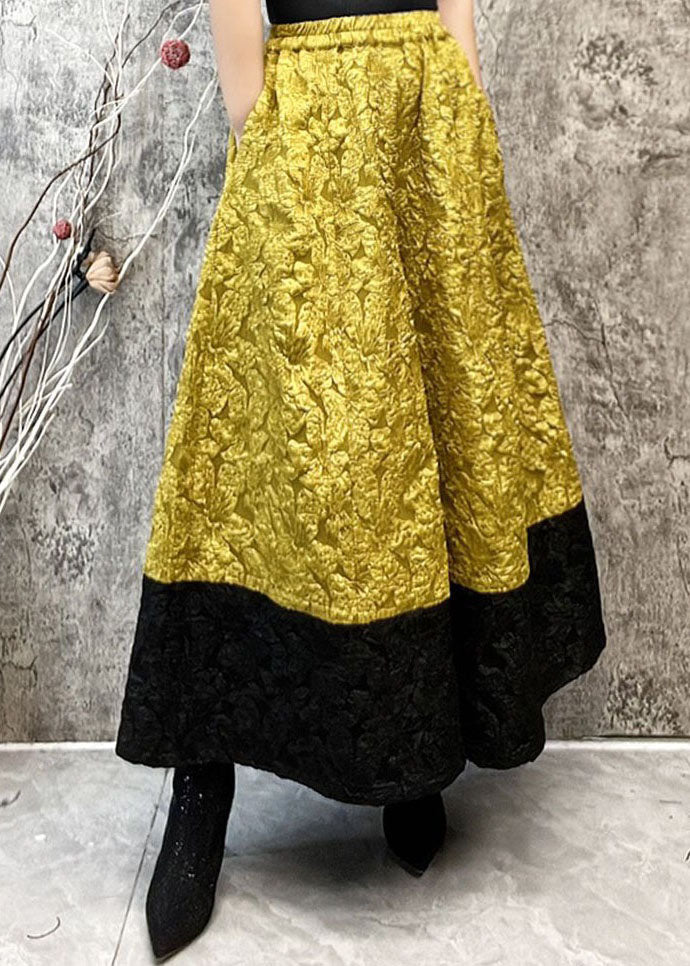Pantalones anchos de seda con diseño de patchwork y bolsillos amarillos de moda para primavera.