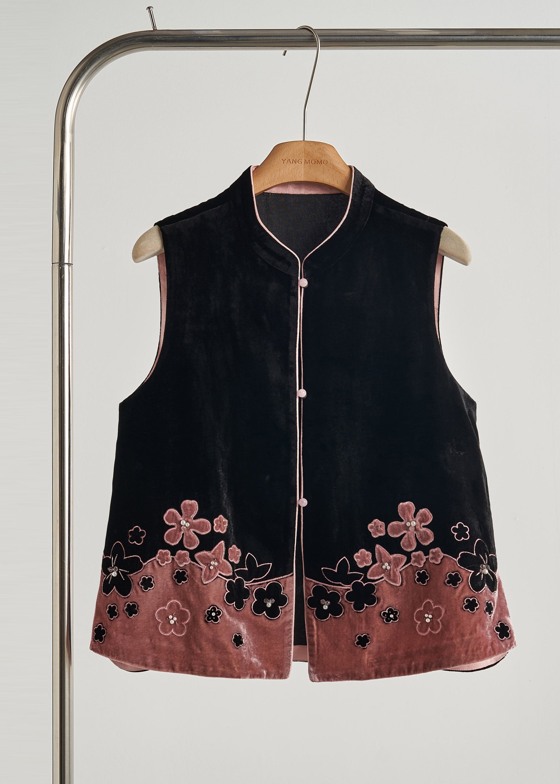 Fine Black Mandarin Collar Patchwork Flower Silk Velour Tops Fall