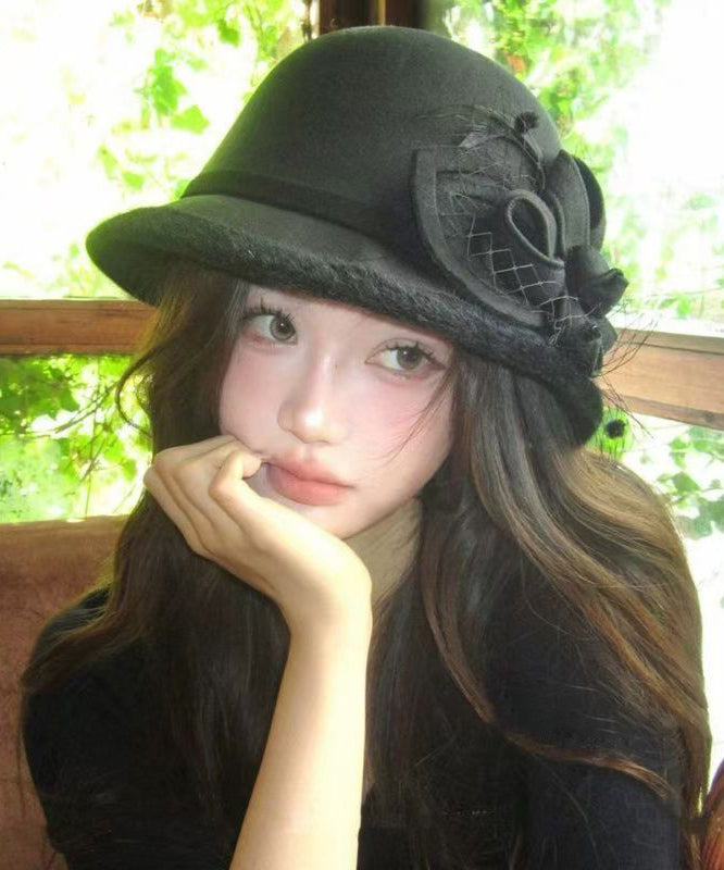 Sombrero de pescador cálido de lana con estampado floral de tul negro francés