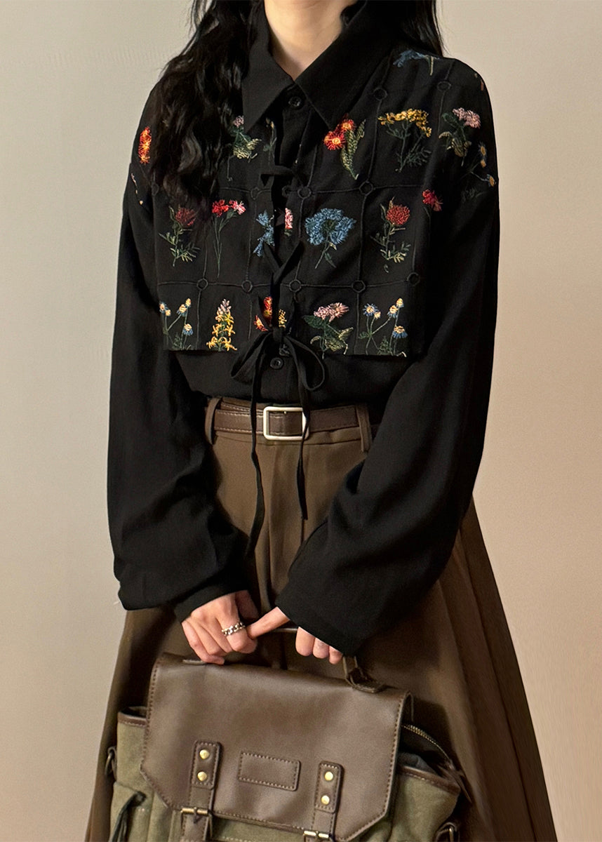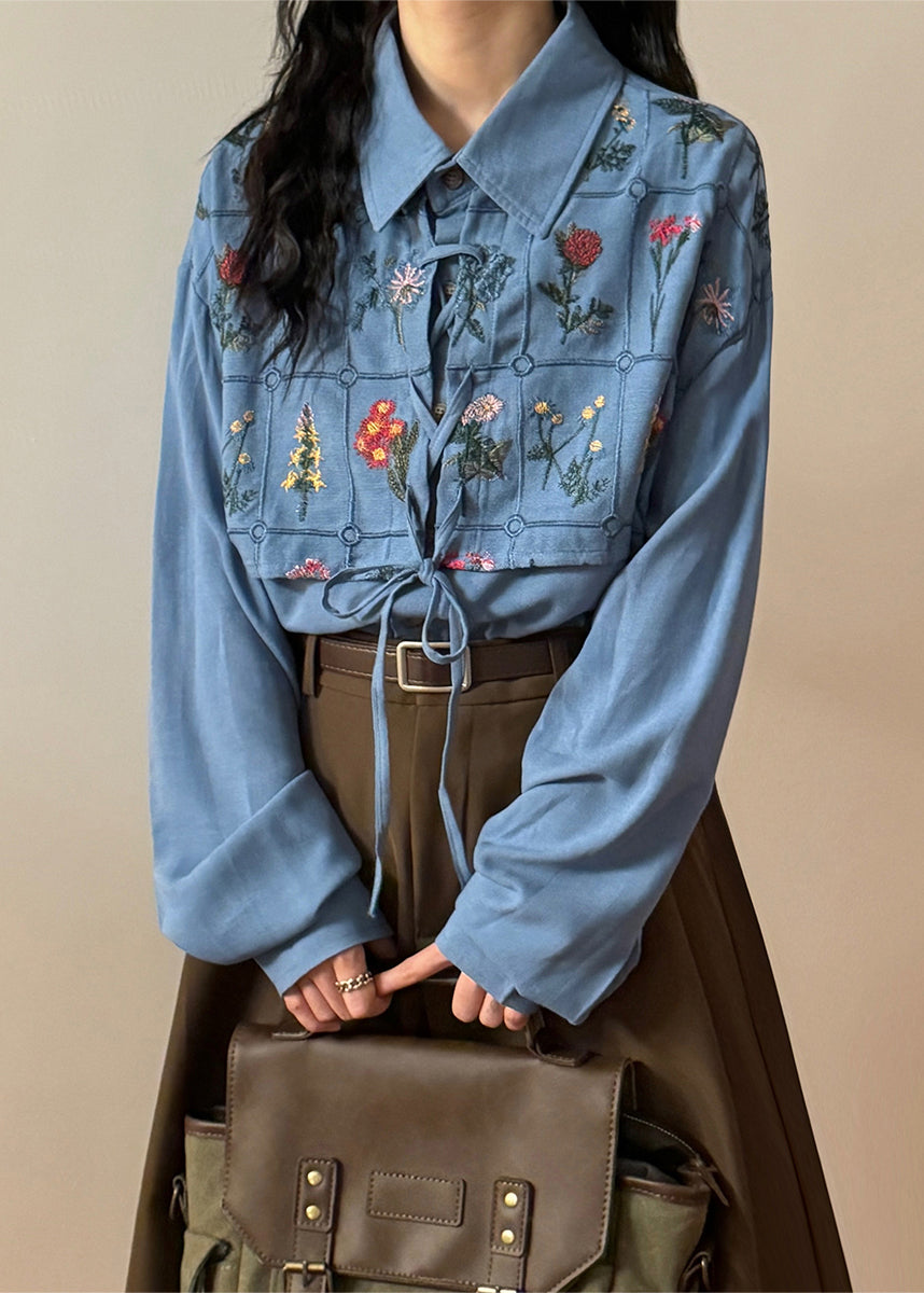 French Blue Embroidered Lace Up Cotton Blouses Spring