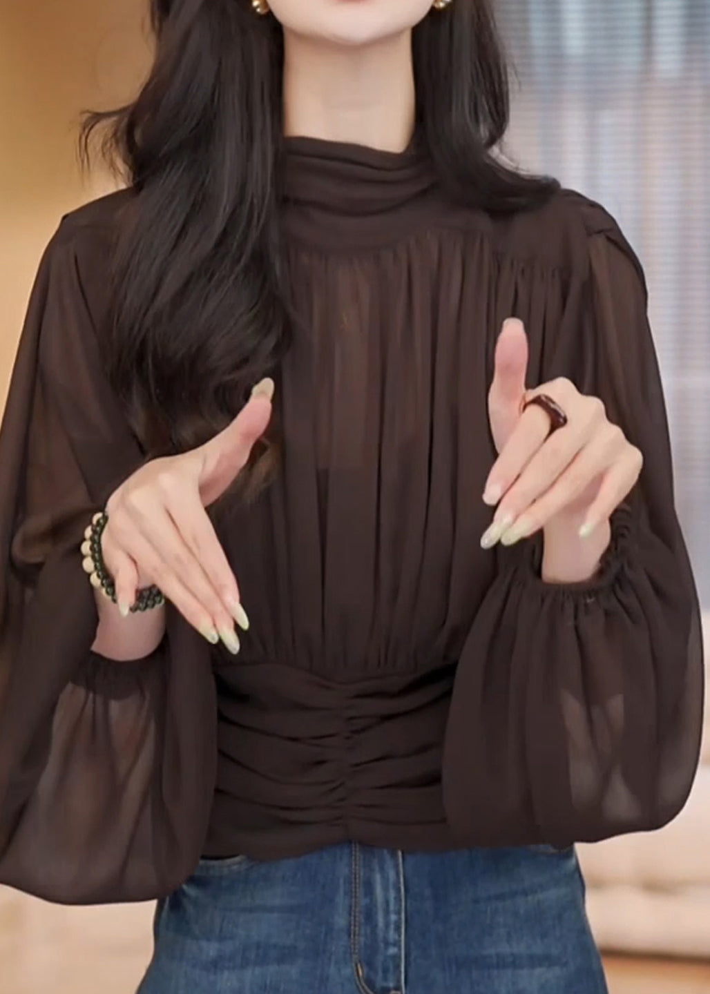 Camisa de gasa arrugada con cuello alto y mangas farol en color chocolate francés