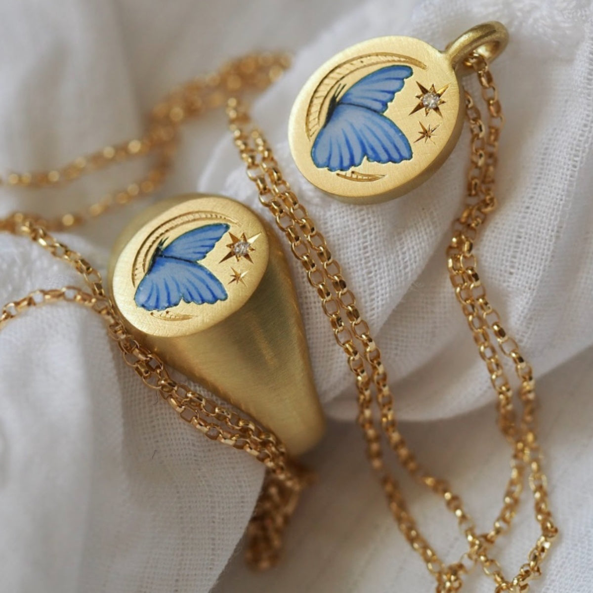 Fabricado en fina plata de ley dorada con forma de mariposa.