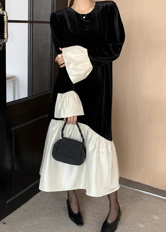 Vestido largo italiano de terciopelo de seda con cuello redondo y mangas acampanadas, color negro