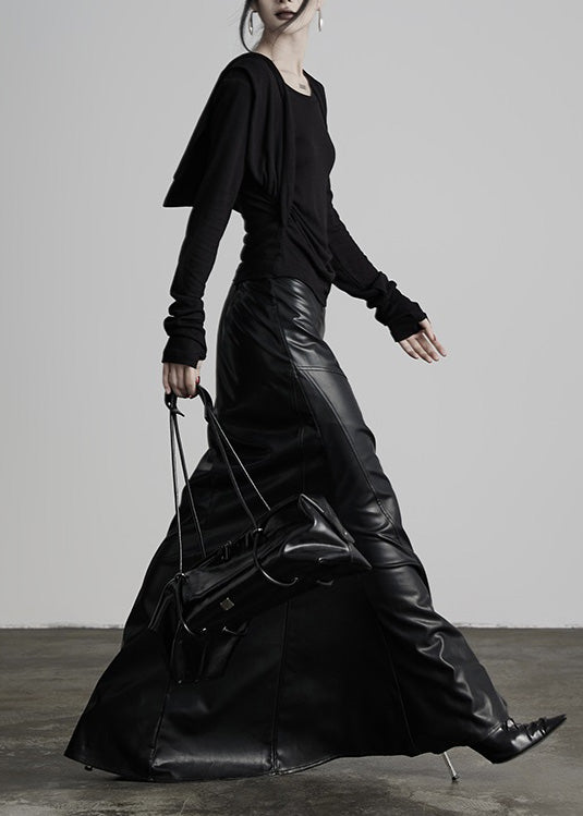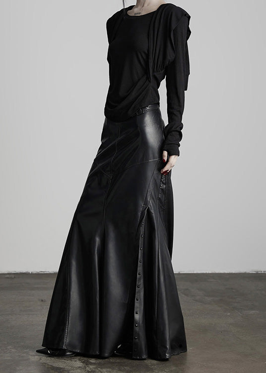 Faldas italianas de piel sintética con remaches negros, cintura alta y patchwork para invierno