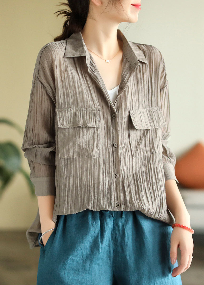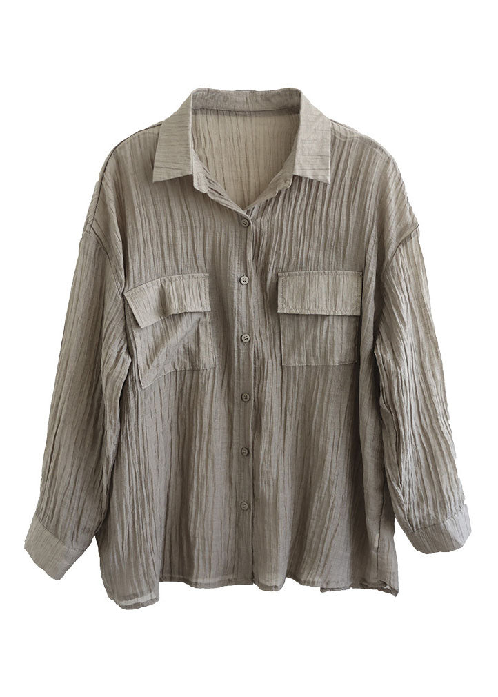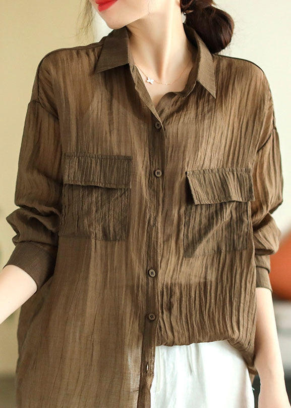 Camisa de lino con cuello Peter Pan y diseño de patchwork arrugado en color café italiano para primavera