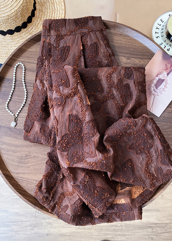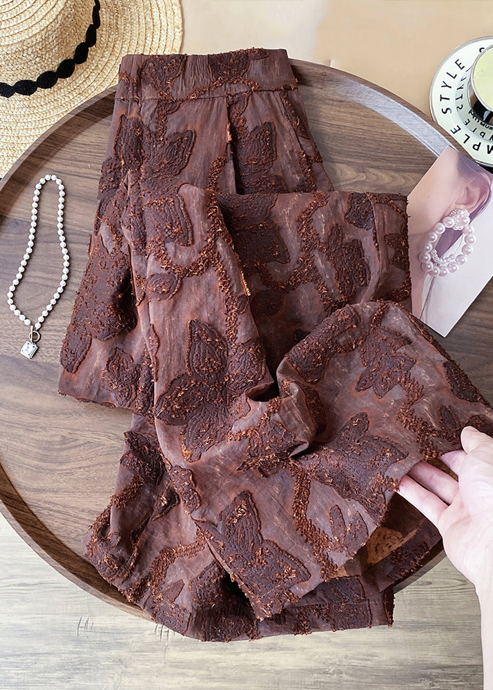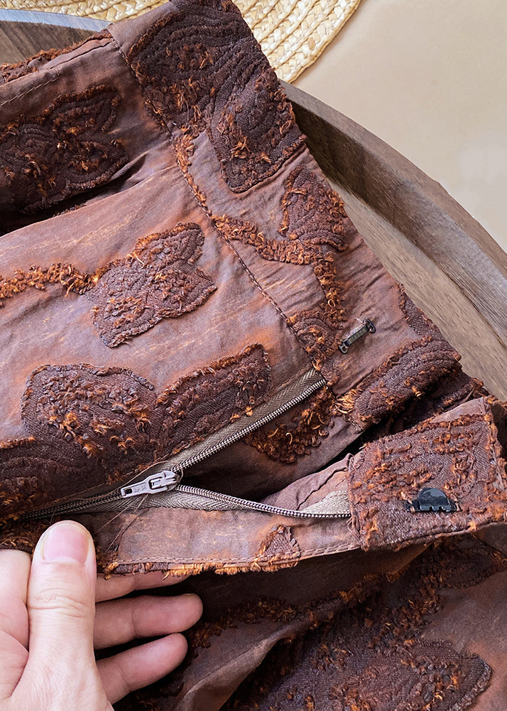 Pantalones de algodón de cintura alta con cremallera marrón jacquard para primavera