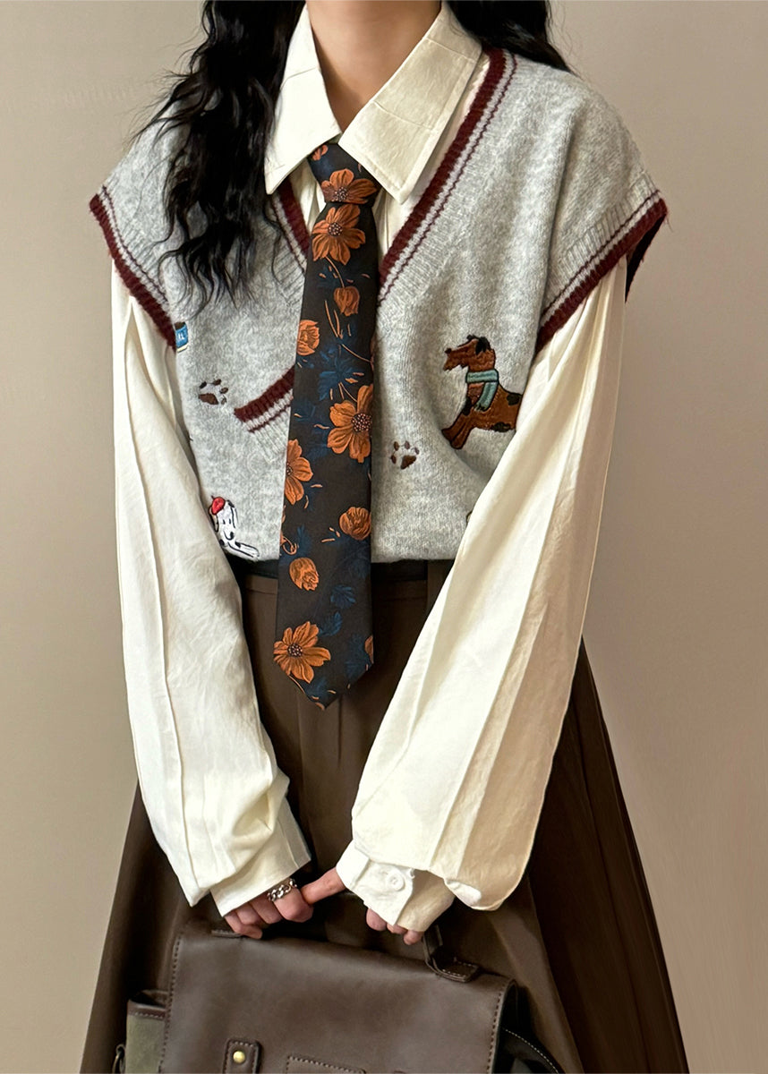 Loose Green V Neck Animal Cozy Knit Vest Sleeveless