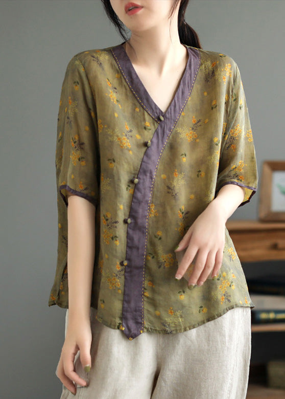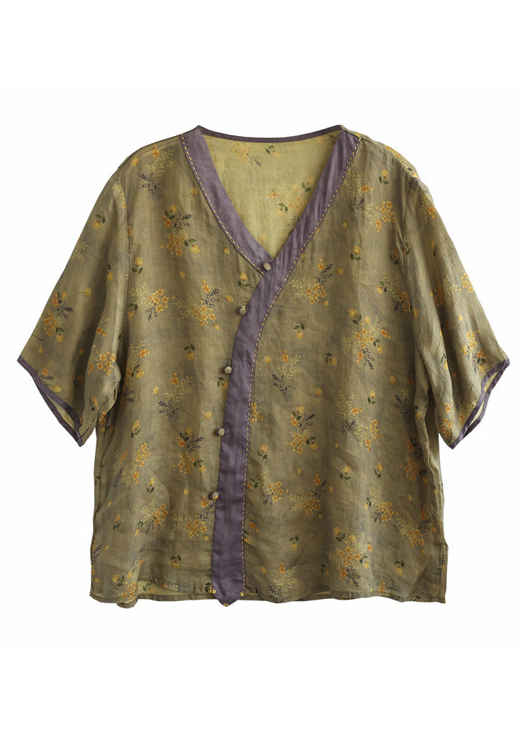 Top holgado de ramio con botones y cuello en V amarillo para verano
