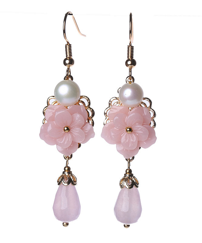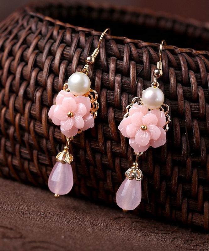 Pendientes colgantes modernos de flor sintética con perla de jade dorada en rosa