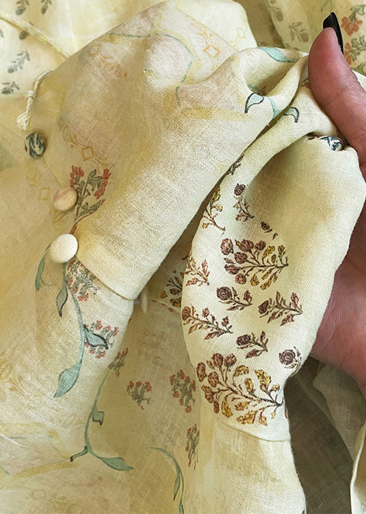 New Yellow V Neck Print Lace Up Cotton Blouse Tops Fall