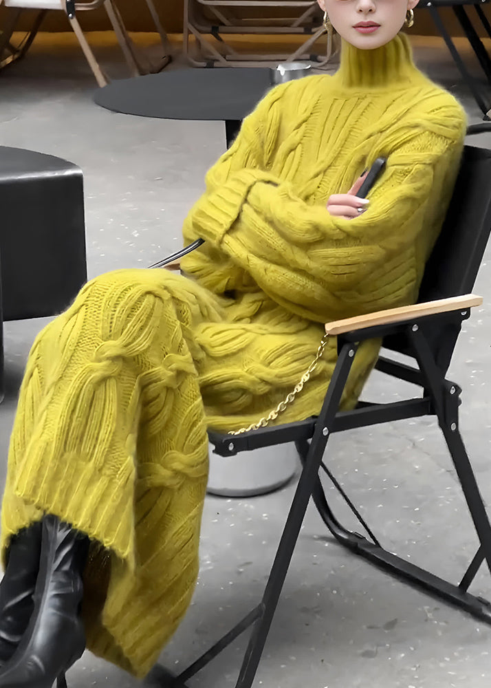 Organic Yellow Turtleneck Tunic Cotton Knit Long Sweater Dress Fall