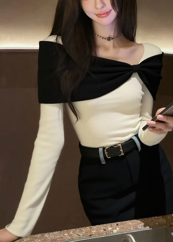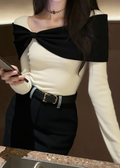 Suéter de punto con diseño original de patchwork y lazo blanco para invierno