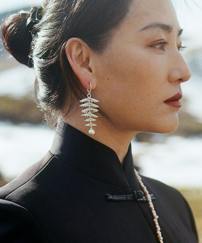 Pendientes colgantes extragrandes de plata de ley con forma de árbol de perlas y seda