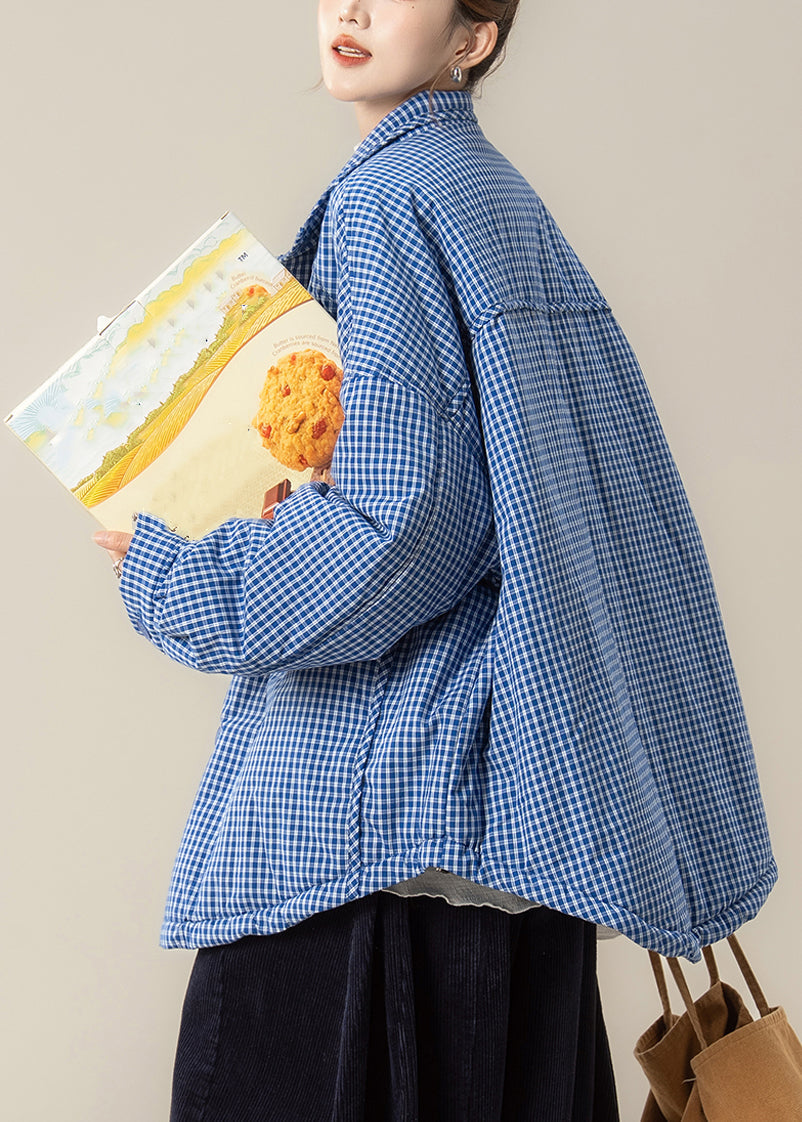Chaquetas de plumón a cuadros con cuello Peter Pan azul de talla grande para invierno