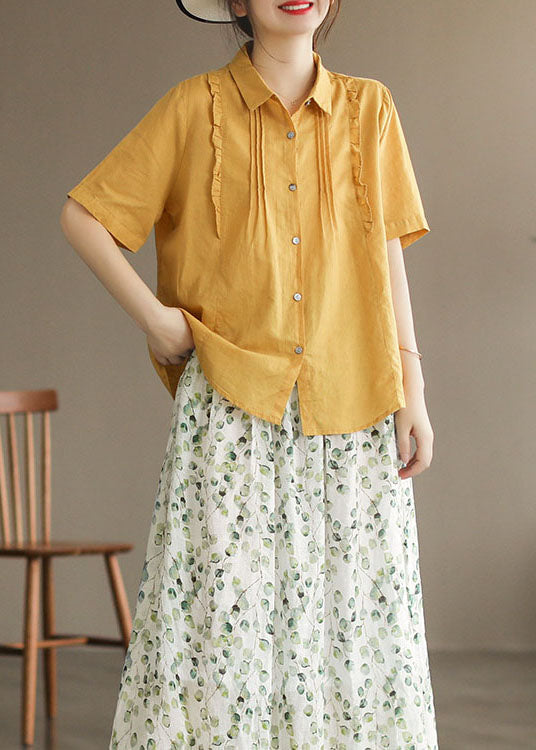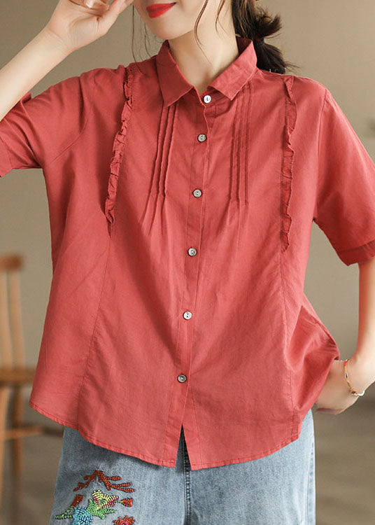 Tops de algodón con patchwork rojo, cuello Peter Pan, botones con volantes y manga corta