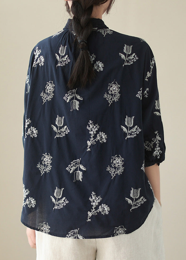 Camisa de algodón azul marino retro con cuello Peter Pan, estampado, botones calados, media manga
