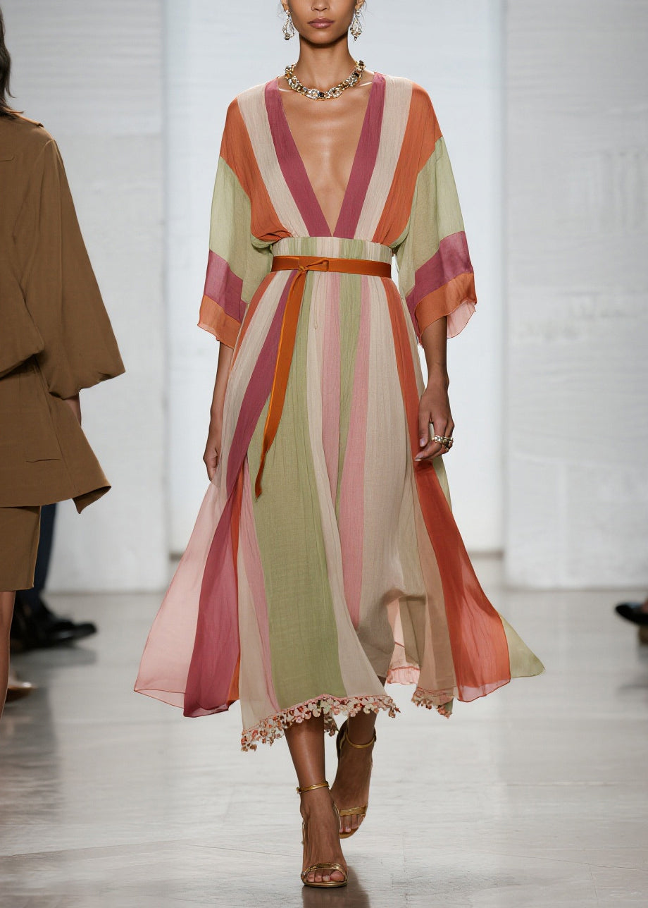 Simple Colorblock V Neck Patchwork Cotton Dress Bracelet Sleeve