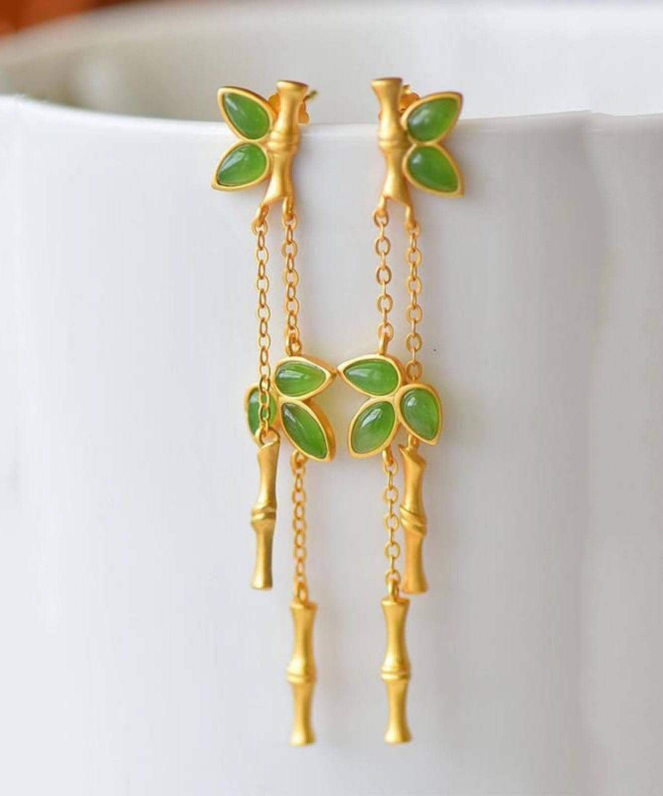 Pendientes colgantes finos de jade y bambú en plata de ley verde sobredorada