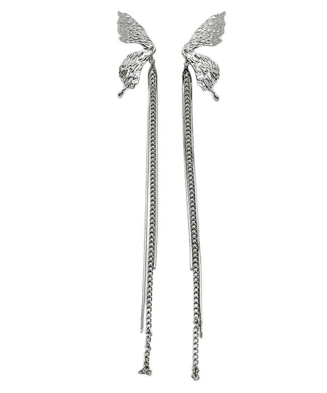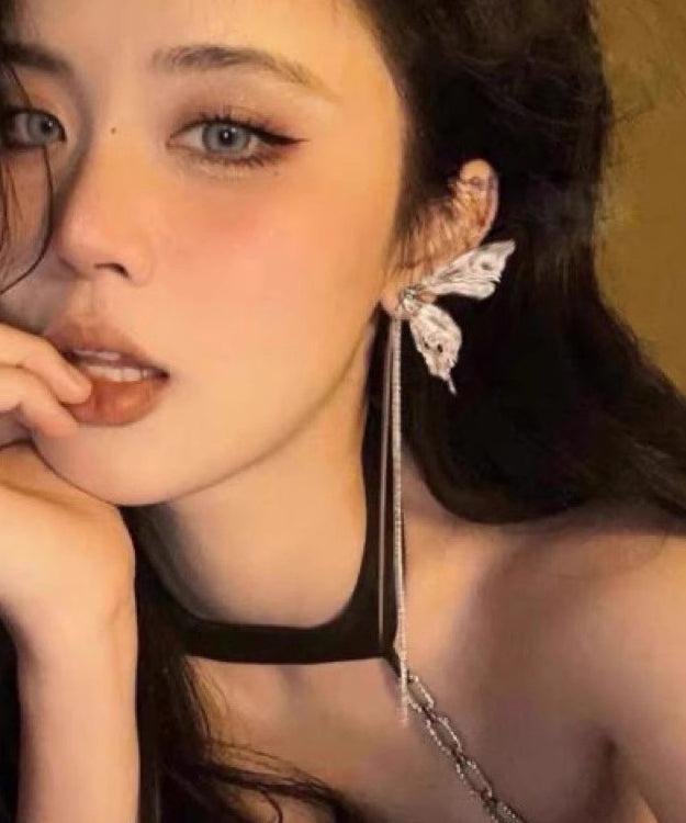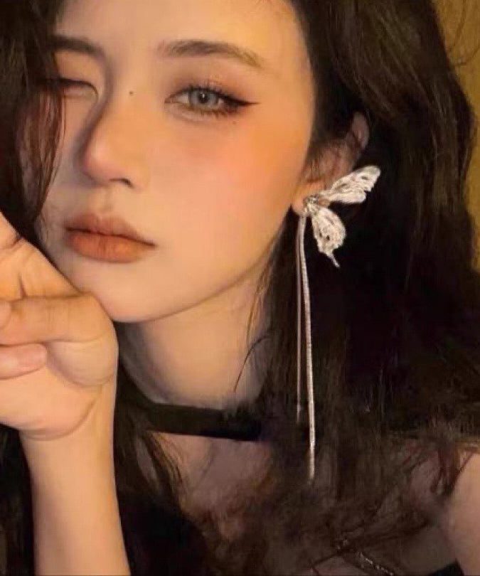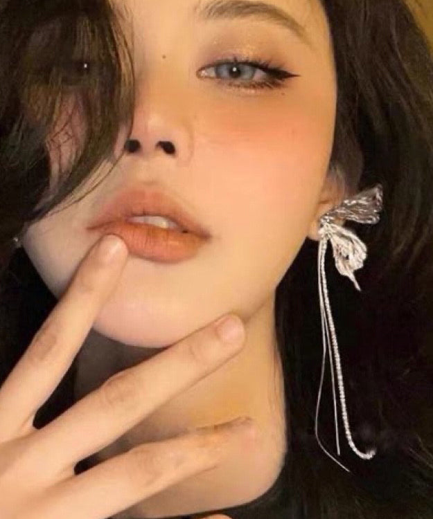 Pendientes colgantes de borla de mariposa de plata de ley y seda fina