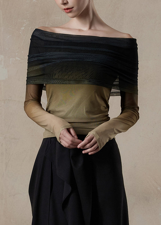 Camiseta de tul con cuello oblicuo y degradado de color, corte entallado, primavera
