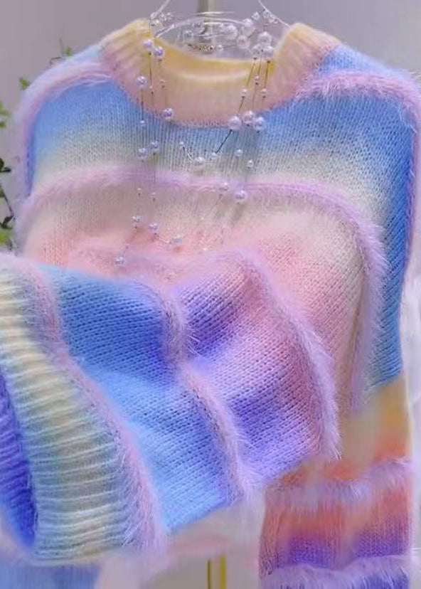 Suéter de punto acogedor con cuello redondo y degradado de color verde a rayas para invierno